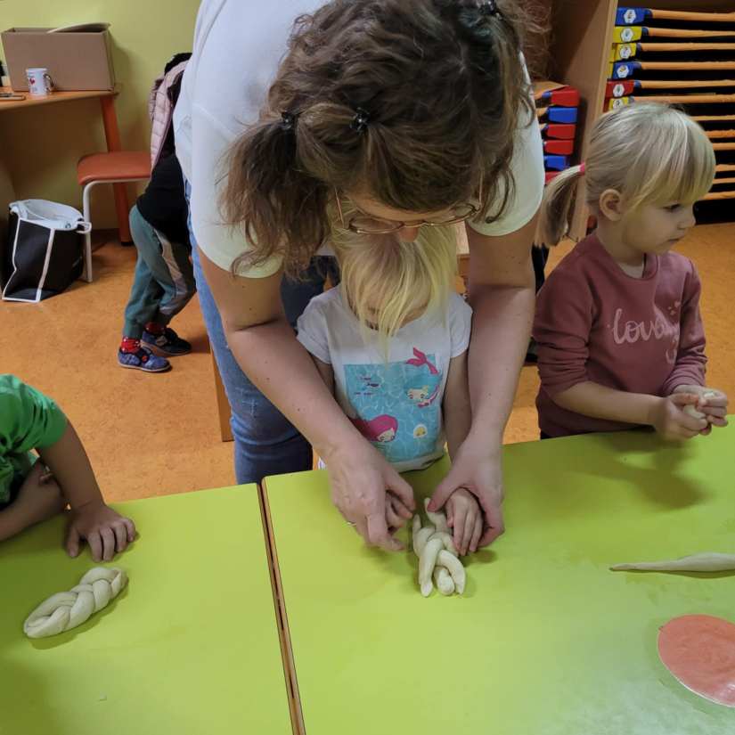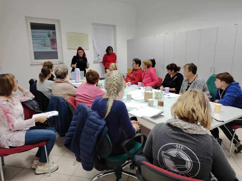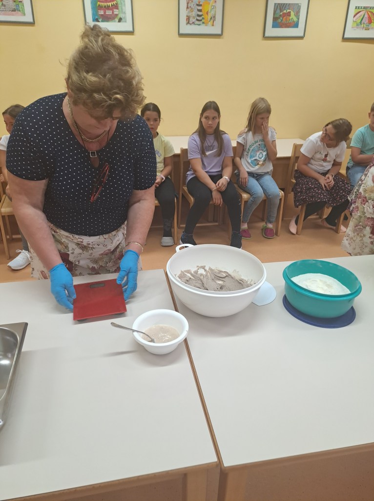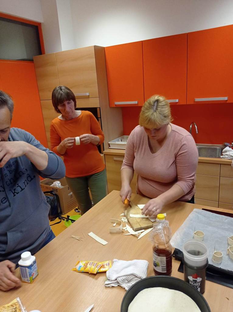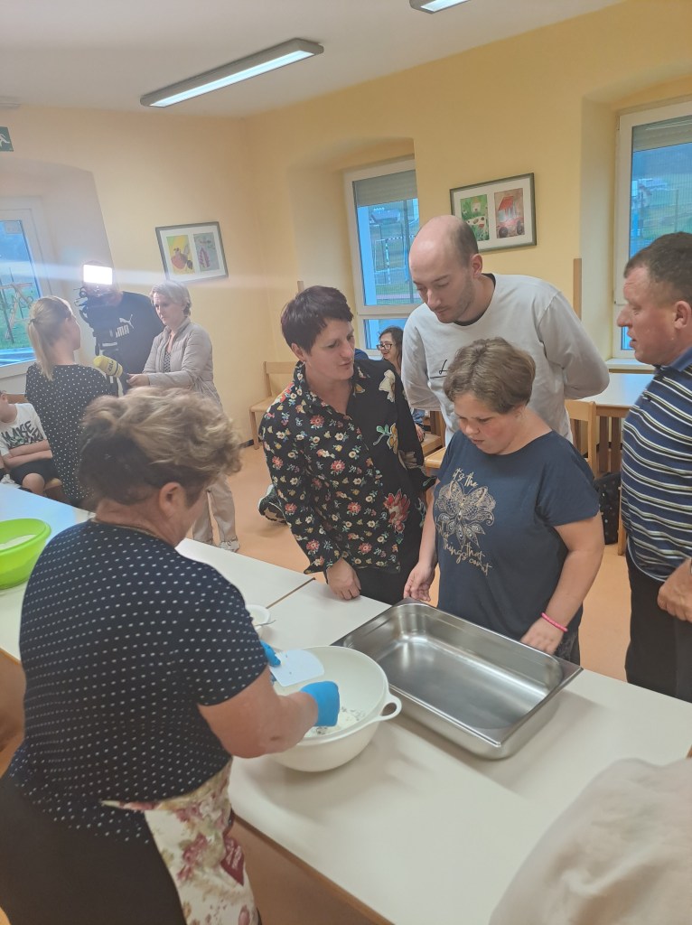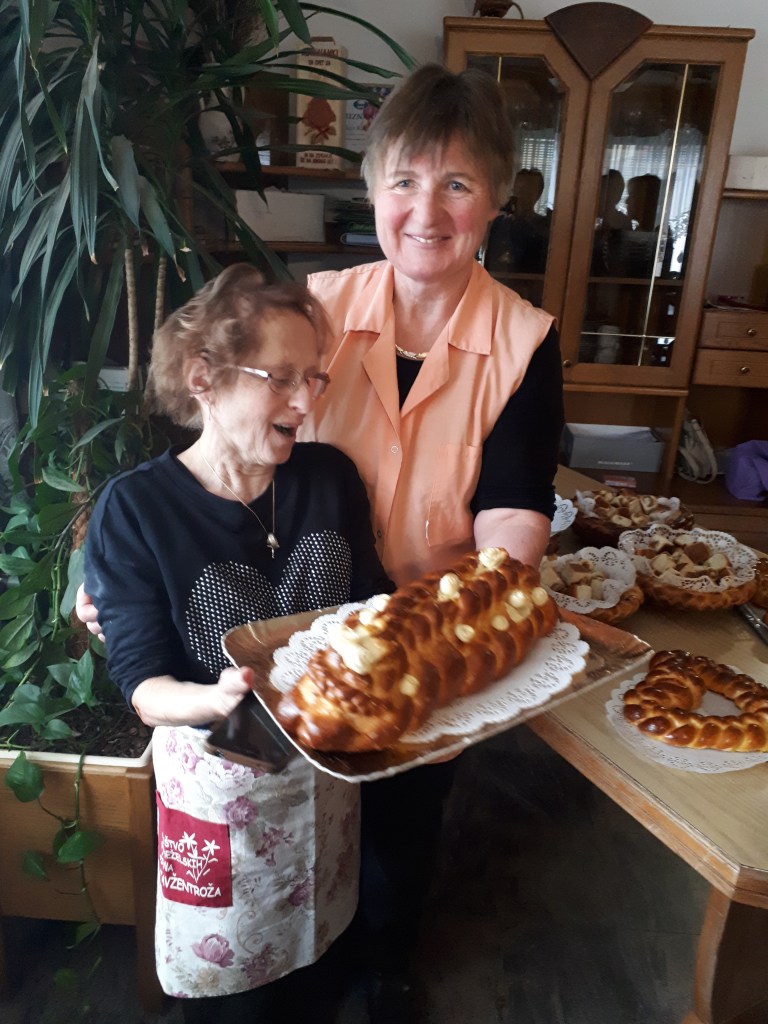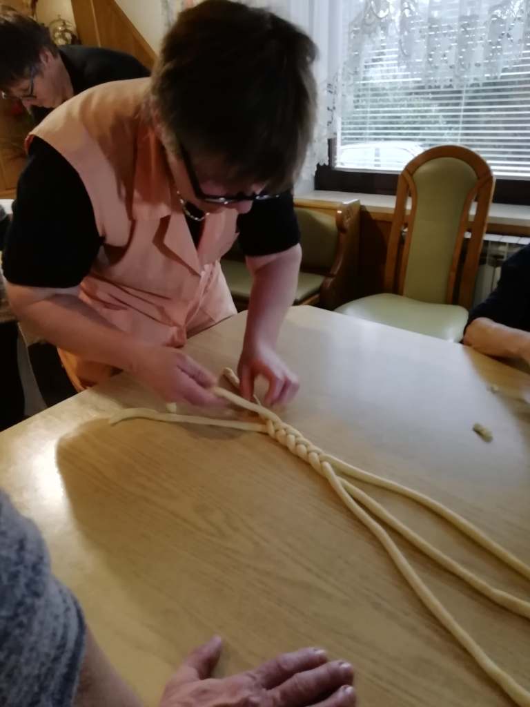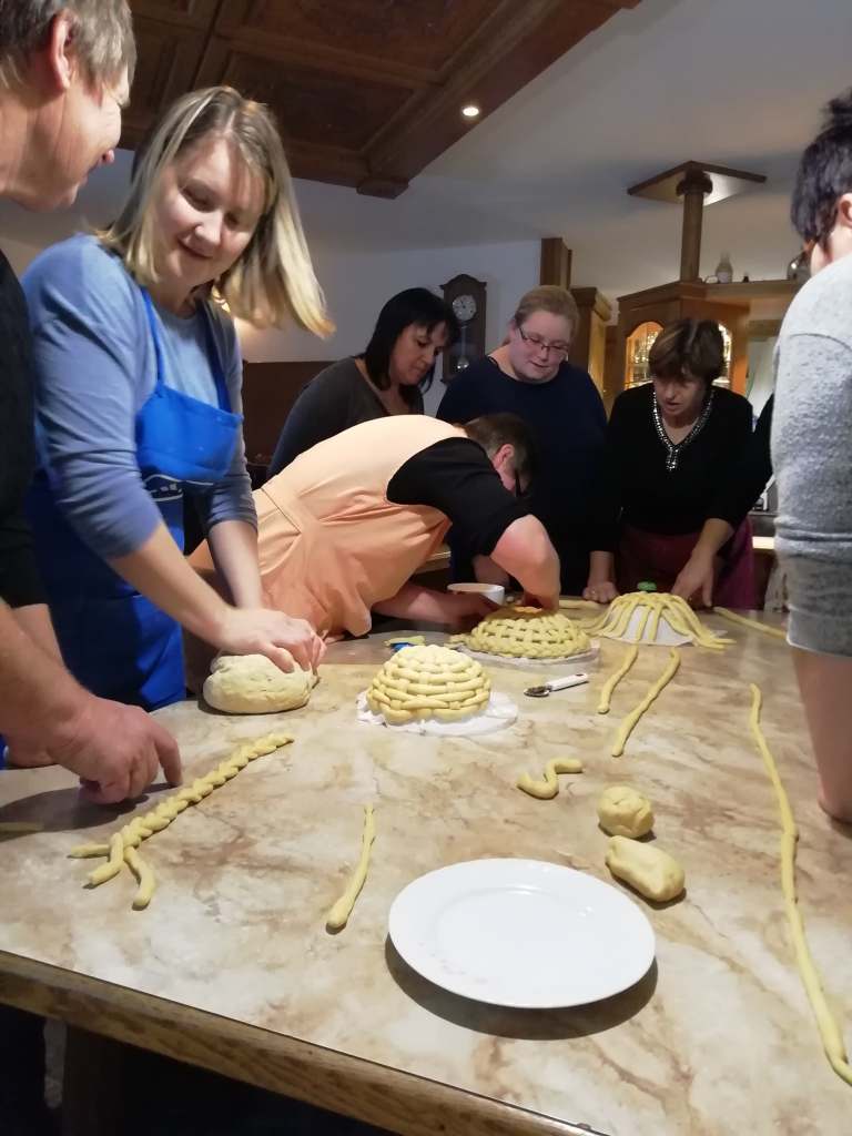Rdeča nit našega društva je že vrst let prenos znanja na mlajše generacije – predvsem pouk o pomenu našega osnovnega živila kruha. S tem namenom se članice rade odzovemo vabilu različnih institucij. Septembra smo se z veseljem odzvale na vabilo VDC Novo mesto in »v jati z drugačnimi« preživele prekrasen dopoldan. V letošnjem letu je bilo organizirano že 6. mednarodno srečanje oseb z motnjo in brez motnje v duševnem in telesnem razvoju. Skupaj z varovanci VDC Novo mesto – enota Trebnje ter osnovnošolci OŠ Dobrič smo spekle različne pekovske izdelke. Vsi sodelujoči so rade volje zavihali rokave in tudi sami ustvarili na oko lepe in še pomembneje, po okusu odlične pletenice.