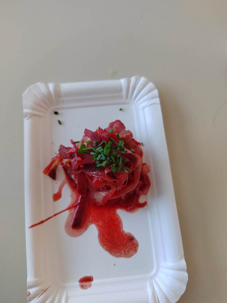 - svinjsko ribico s čebulo, porom in rdečo peso