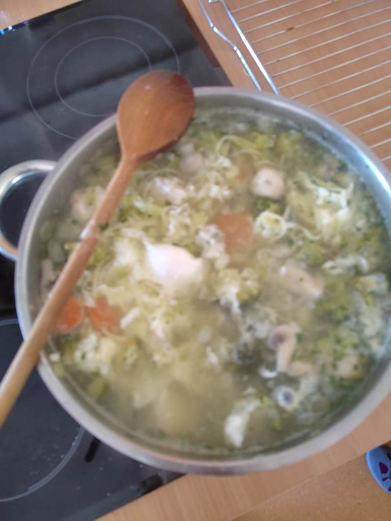 - juho z zelenjavo, piščancem, rezanci in jajcem